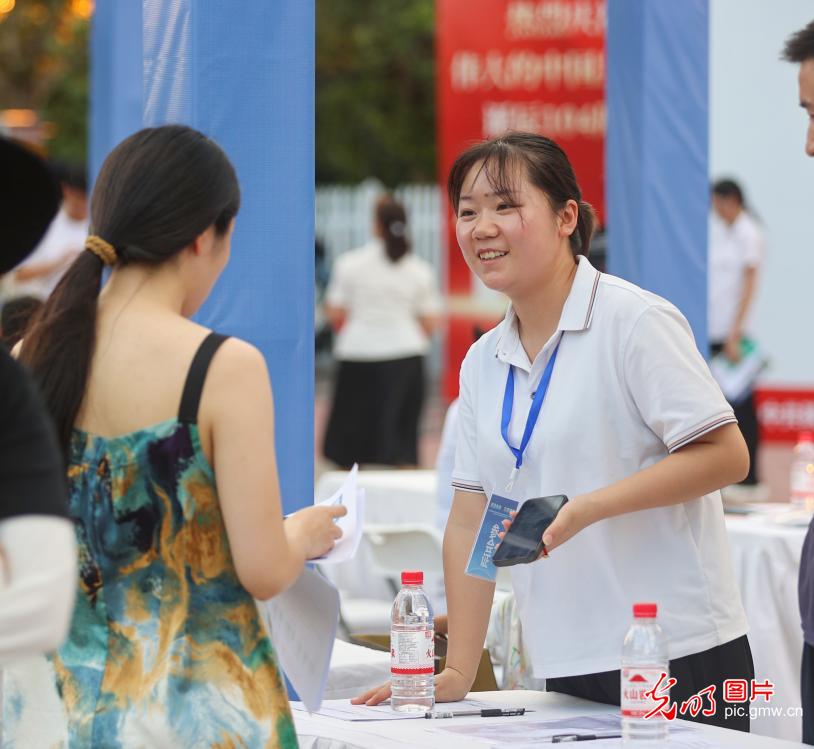 河南省三门峡市陕州区在甘棠公园前广场举办“职引未来 筑梦青春”专场招聘会。70余家企业带来2100多个岗位,涵盖制造业、电子信息、服务业等多个领域。图为求职者在招聘会上了解咨询招聘信息。(孙猛摄/光明图片)